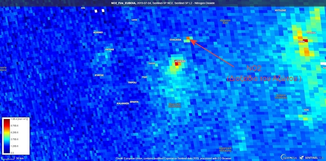 Στη δεύτερη δορυφορική φωτογραφία από τον Sentinel 5 διακρίνονται οι αυξημένες συγκεντρώσεις διοξειδίου του Αζώτου, δεξιά από την περιοχή της Χαλκίδας.