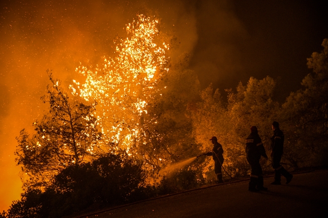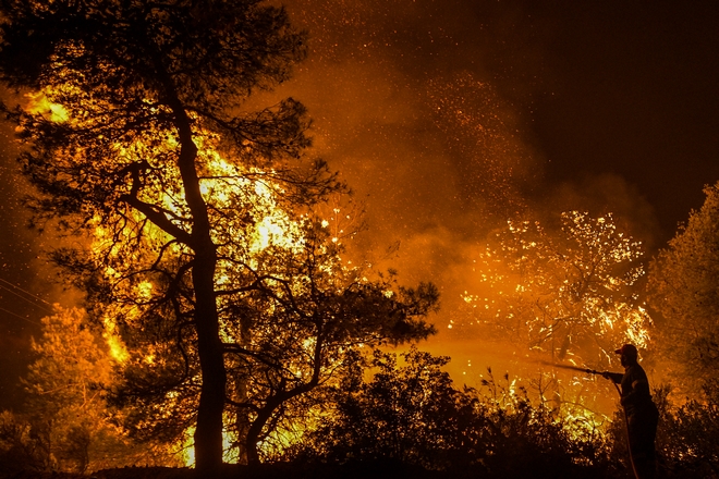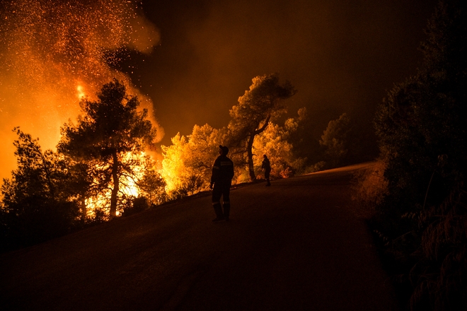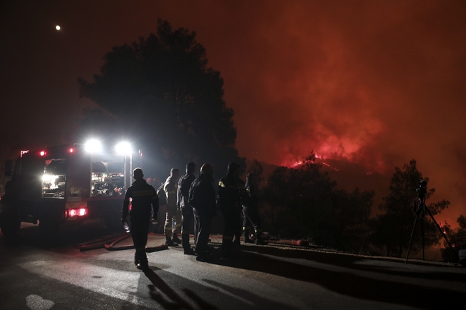 Πυροσβέστες προσπαθούν αργά το βράδυ να περιορίσουν την μεγάλη φωτιά στην Εύβοια Eurokinissi