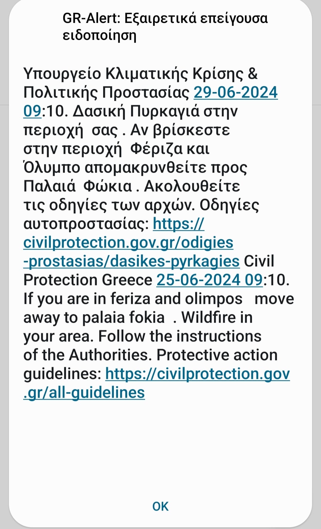 Μάλιστα, στάλθηκε μήνυμα του 112 για απομάκρυνση των κατοίκων που βρίσκονται στις περιοχές Φέριζα και Όλυμπο Κερατέας προς Παλαίά Φώκια.