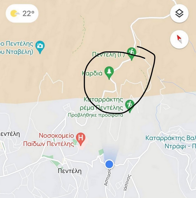 H περιοχή της αναζωπύρωσης με τις φλόγες να κινούνται προς την Καλλιθέα Πεντέλης