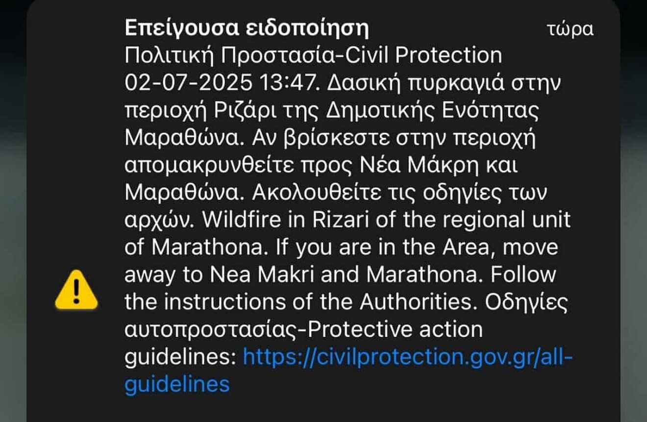 Παράλληλα, ήχησε το 112 καλώντας τους κατοίκους που βρίσκονται στην περιοχή Ριζάρι να απομακρυνθούν προς Νέα Μάκρη και Μαραθώνα. Συγκεκριμένα το μήνυμα αναφέρει: «Δασική πυρκαγιά στην περιοχή Ριζάρι της Δημοτικής Ενότητας Μαραθώνα. Αν βρίσκεστε στην περιοχή απομακρυνθείτε προς Νέα Μάκρη και Μαραθώνα. Ακολουθείτε τις οδηγίες των αρχών».