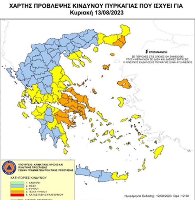 Σύμφωνα με το Χάρτη Πρόβλεψης Κινδύνου Πυρκαγιάς που εκδίδει η Γενική Γραμματεία Πολιτικής Προστασίας του Υπουργείου Κλιματικής Κρίσης & Πολιτικής Προστασίας (www.civilprotection.gr), για αύριο, Κυριακή, 13 Αυγούστου 2023, προβλέπεται πολύ υψηλός κίνδυνος πυρκαγιάς (κατηγορία κινδύνου 4) για τις εξής περιοχές: