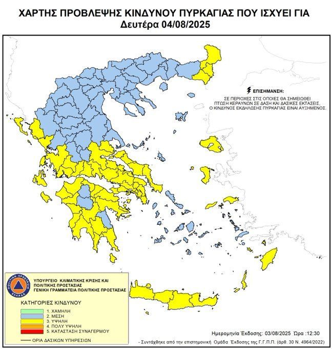 Υψηλός κίνδυνος πυρκαγιάς (κατηγορία κινδύνου 3) προβλέπεται για σήμερα, Δευτέρα 4 Αυγούστου, σε αρκετές περιοχές της χώρας, σύμφωνα με τον Χάρτη Πρόβλεψης Κινδύνου Πυρκαγιάς που εκδίδει η γενική γραμματεία Πολιτικής Προστασίας του υπουργείου Κλιματικής Κρίσης & Πολιτικής Προστασίας.