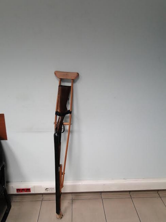 Σε έρευνα που πραγματοποιήθηκε στο σπίτι του, αλλά και στο χώρο εργασίας του, μετά την ταυτοποίηση της ληστείας, βρέθηκε η πατερίτσα με την καραμπίνα και ένα ακόμα όπλο.