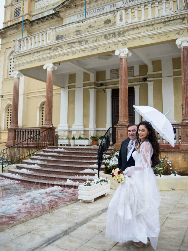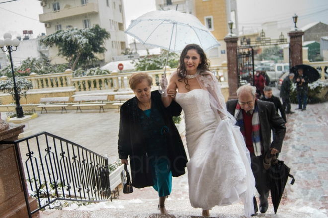 Μέσα σ’ αυτό το σπάνιο και παραμυθένιο σκηνικό, η Γεωργία, με ένα δαντελένιο νυφικό και κρατώντας ολόλευκη ομπρέλα, όχι μόνο δεν πτοήθηκε από τον χιονιά αλλά περήφανη και… ατρόμητη, ανέβηκε τα σκαλιά και κατευθύνθηκε στον Ναό, όπου την περίμενε ο αγαπημένος της, Ανδρέας.