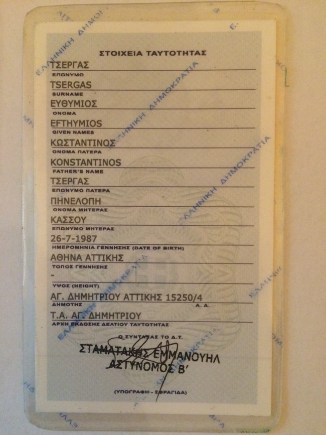 Το πλαστό δελτίο φέρει αριθμό ΑΑ 011583 και φέρεται να εκδόθηκε στις 4 Μαρτίου 2005 από το τμήμα ασφαλείας Αγίου Δημητρίου, υπό στοιχεία ΤΣΕΡΓΑΣ Ευθύμιος του Κωνσταντίνου και της Πηνελόπης, γεννηθείς στις 26 Ιουλίου 1987 στην Αθήνα.