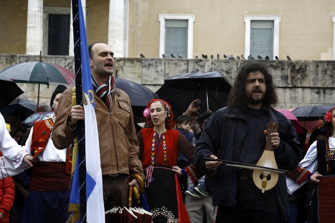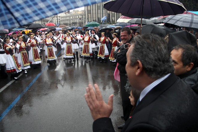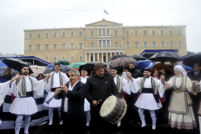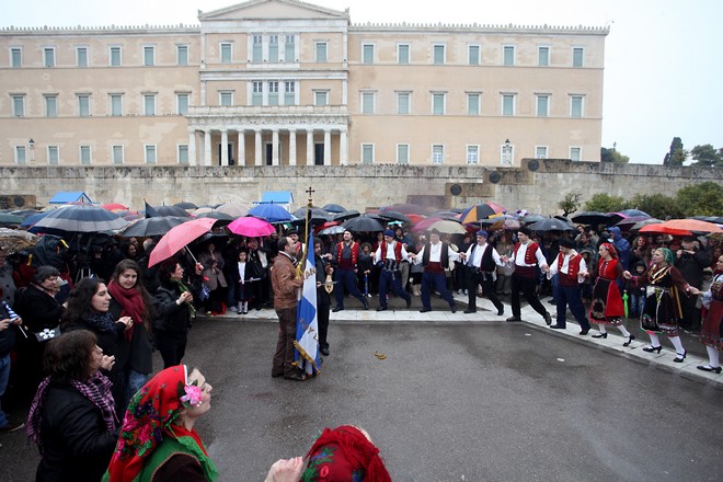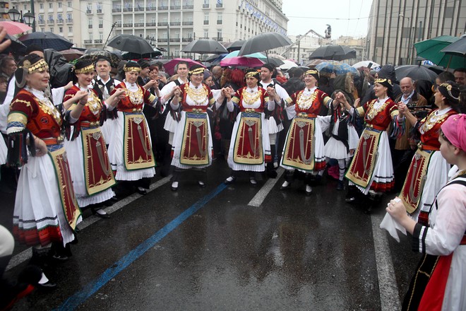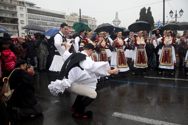 Η φετινή καινοτομία των εορτασμών της 25ης Μαρτίου ήταν αναμφισβήτητα οι παραδοσιακοί χοροί στη μέση του δρόμου. Φουστανέλες και βράκες, παραδοσιακές στολές και λύρες κατέκλυσαν την Αθήνα με τον κόσμο να παραμένει στο δρόμο παρά τη βροχή (pics)