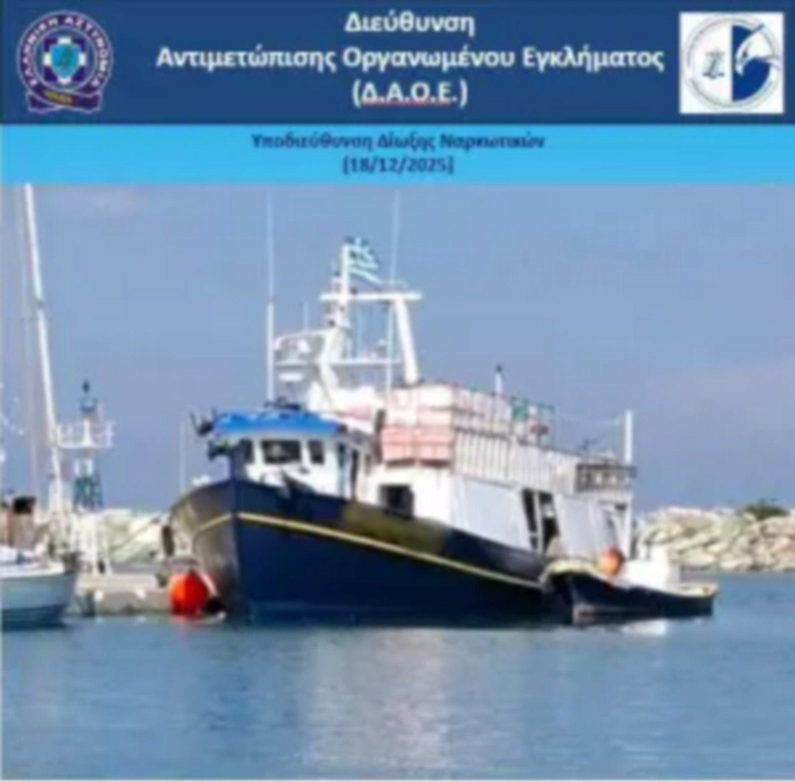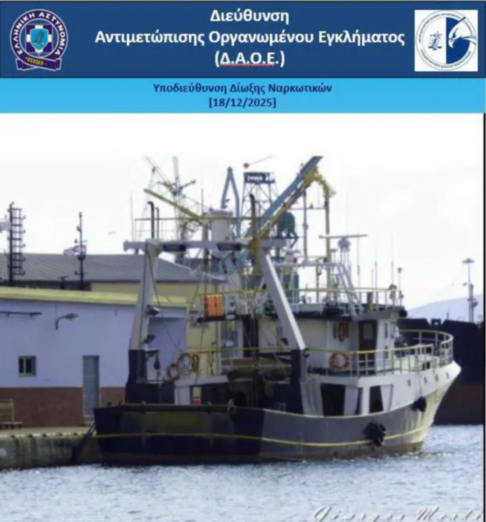 Για τον τερματισμό της δράσης τους, πρωινές ώρες της Κυριακής, 14 Δεκεμβρίου 2025, πραγματοποιήθηκε ευρείας κλίμακας διεθνική επιχείρηση κατά την οποία μέλη της εγκληματικής οργάνωσης, τέσσερις ημεδαποί (61χρονος, 79χρονος, 72χρονος και 68χρονος) και ο 46χρονος αλλοδαπός, εντοπίστηκαν από το Πολεμικό Ναυτικό της Γαλλίας να πλέουν με ελληνικό αλιευτικό σκάφος σε υπερπόντια περιοχή της Γαλλίας.