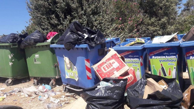 Το μάζεμα των σκουπιδιών όπως μαρτυρούν οι φωτογραφίες, πρέπει να έχει παραληφθεί αρκετές μέρες, ενώ το μοναδικό απορριματοφόρο του νησιού δείχνει ακινητοποιημένο.