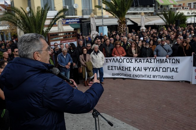 Στην πλατεία Σαπφούς συγκεντρώθηκαν επιχειρηματίες, υπάλληλοι και κάτοικοι της Λέσβου ζητώντας την αναστολή της αύξησης του ΦΠΑ στα νησιά
