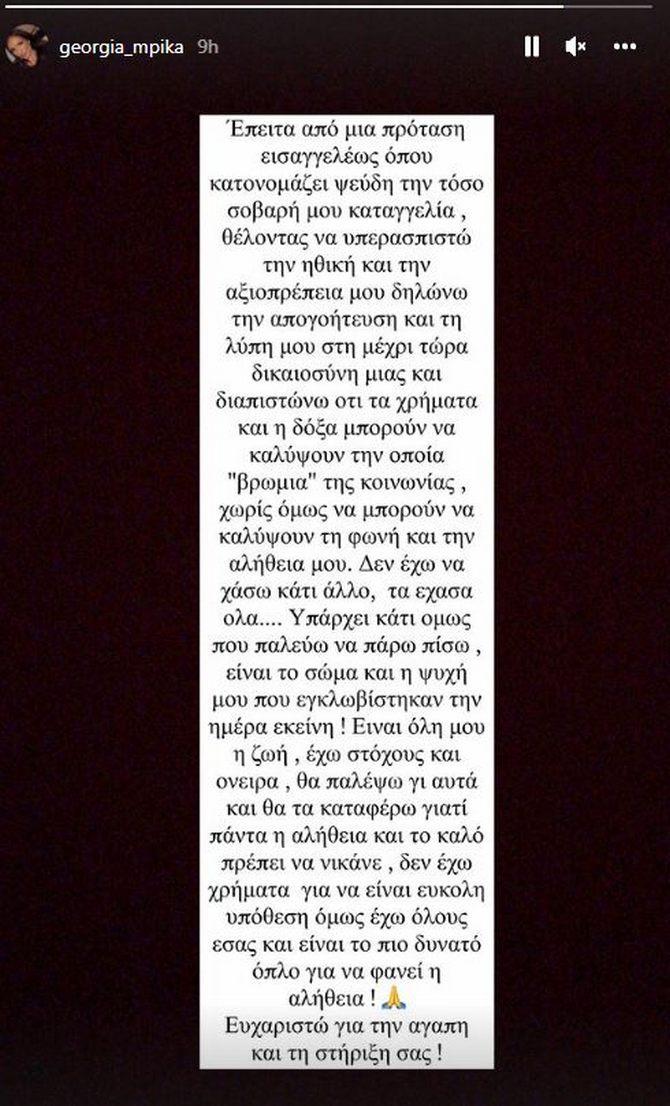 “Έπειτα από μια πρόταση εισαγγελέως όπου κατονομάζει ψεύδη την τόσο σοβαρή μου καταγγελία, θέλοντας να υπερασπιστώ την ηθική και την αξιοπρέπειά μου δηλώνω την απογοήτευση και τη λύπη μου στη μέχρι τώρα δικαιοσύνη, μιας και διαπιστώνω ότι τα χρήματα και η δόξα μπορούν να καλύψουν την όποια ”βρωμιά” της κοινωνίας, χωρίς όμως να μπορούν να καλύψουν τη φωνή και την αλήθεια μου. Δεν έχω να χάσω κάτι άλλο, τα έχασα όλα… Υπάρχει κάτι, όμως, που παλεύω να πάρω πίσω, είναι το σώμα και η ψυχή μου που εγκλωβίστηκαν την ημέρα εκείνη! Είναι όλη μου η ζωή, έχω στόχους και όνειρα, θα παλέψω γι’ αυτά και θα τα καταφέρω γιατί πάντα η αλήθεια και το καλό πρέπει να νικάνε, δεν έχω χρήματα για να είναι εύκολη υπόθεση, όμως, έχω όλους εσάς και είναι το πιο δυνατό όπλο για να φανεί η αλήθεια! Ευχαριστώ για την αγάπη και τη στήριξή σας”, έγραψε η 24χρονη.