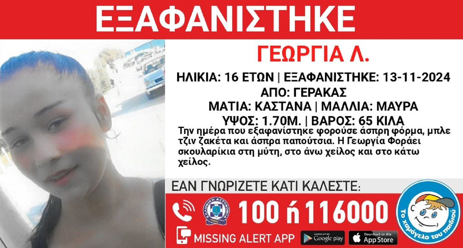 Συναγερμός έχει σημάνει στις Αρχές για την εξαφάνιση της 16χρονης Γεωργίας Λ., τα ίχνη της οποίας χάθηκαν το απόγευμα της Τετάρτης (13/11) από την περιοχή του Γέρακα Αττικής.