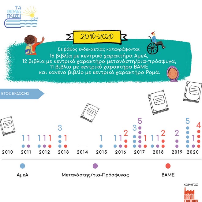 Ενδιαφέρον προκαλεί το γεγονός ότι κατά τη χρονική αφετηρία της έρευνας το 2010 δεν βρέθηκε κανένα βιβλίο με κεντρικό χαρακτήρα που να ανήκει σε μία από τις υπό διερεύνηση κοινωνικές ομάδες, ενώ κατά το 2020 παρουσιάζεται η μεγαλύτερη εκδοτική παραγωγή βιβλίων με αυτούς τους κεντρικούς χαρακτήρες, φτάνοντας συνολικά τα δέκα βιβλία. Τη χρονιά αυτή έχουμε και το μεγαλύτερο αριθμό βιβλίων με κεντρικούς χαρακτήρες ΒΑΜΕ και ΑΜΕΑ, ενώ τα περισσότερα βιβλία της εντεκαετίας με ήρωες πρόσφυγες ή μετανάστες καταγράφονται το 2017.