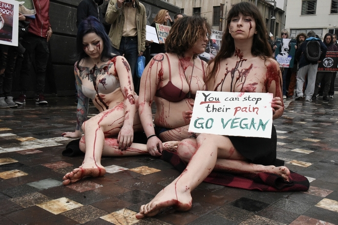 Οι ακτιβιστές κρατούσαν πλακάτ με φωτογραφίες νεκρών ζώων ενώ κάποιοι έβγαλαν τα ρούχα τους και βαμμένοι με μπογιά που θύμιζε αίμα ξάπλωσαν στην πλατεία