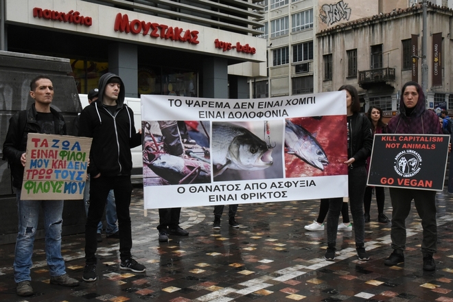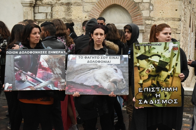 Οι ακτιβιστές για τα δικαιώματα των ζώων συγκεντρώθηκαν στην πλατεία στο Μοναστηράκι κρατώντας πλακάτ με φωτογραφίες νεκρών ζώων ενώ κάποιοι από τους ακτιβιστές έβγαλαν τα ρούχα τους και βαμμένοι με κόκκινη μπογιά που θύμιζε αίμα ξάπλωσαν στην πλατεία.