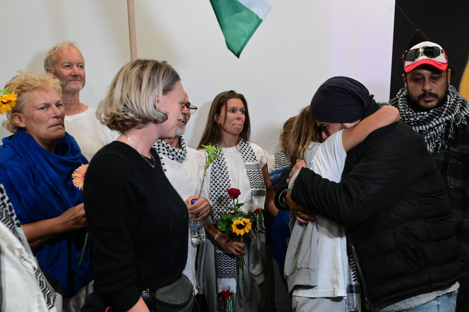 Δεκάδες κόσμου βρέθηκαν στο αεροδρόμιο από το μεσημέρι της Δευτέρας για να υποδεχθούν τους ακτιβιστές, που επέστρεψαν από το Ισραήλ -ανάμεσά τους και οι 27 Έλληνες- κρατώντας πανό με συνθήματα υποστήριξης, λουλούδια καθώς και παλαιστινιακές σημαίες.
