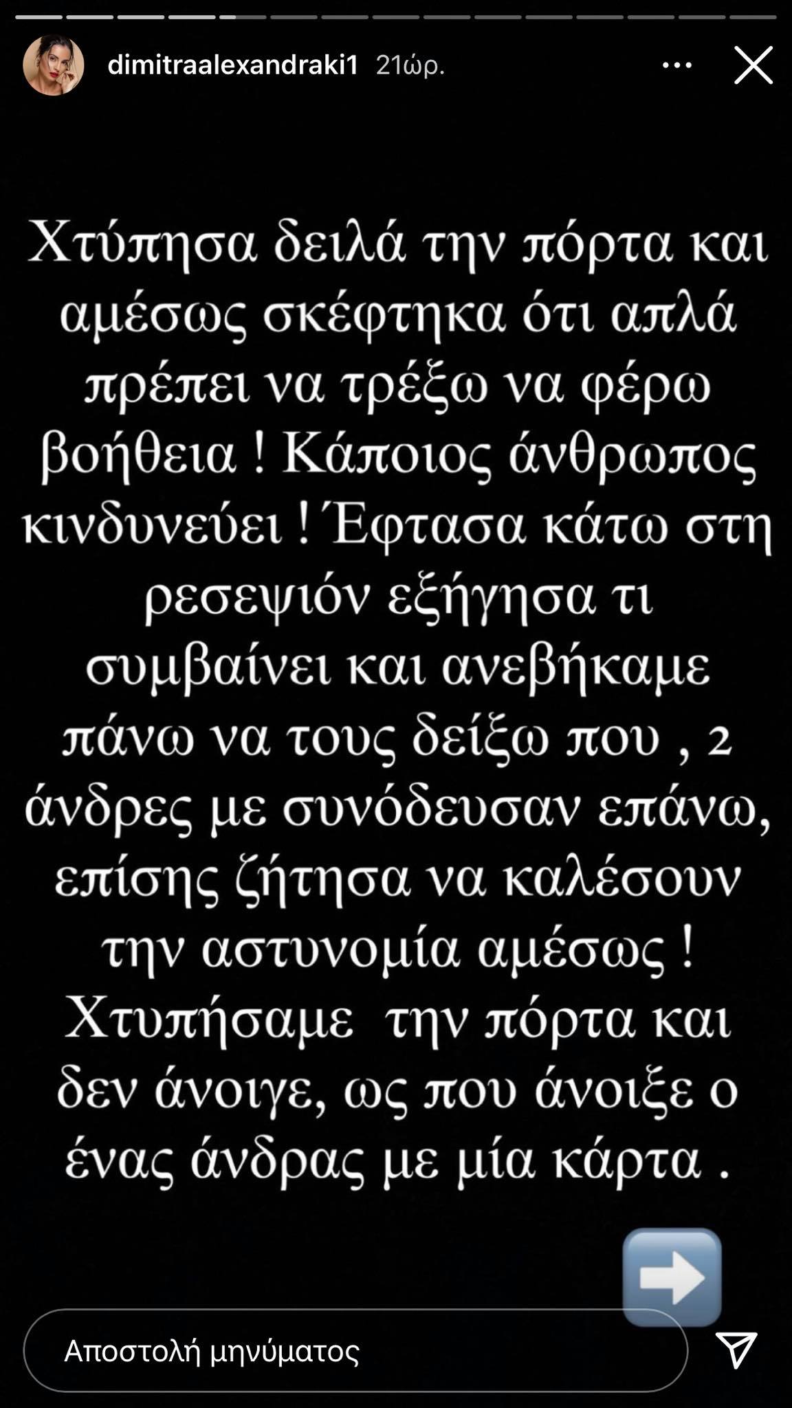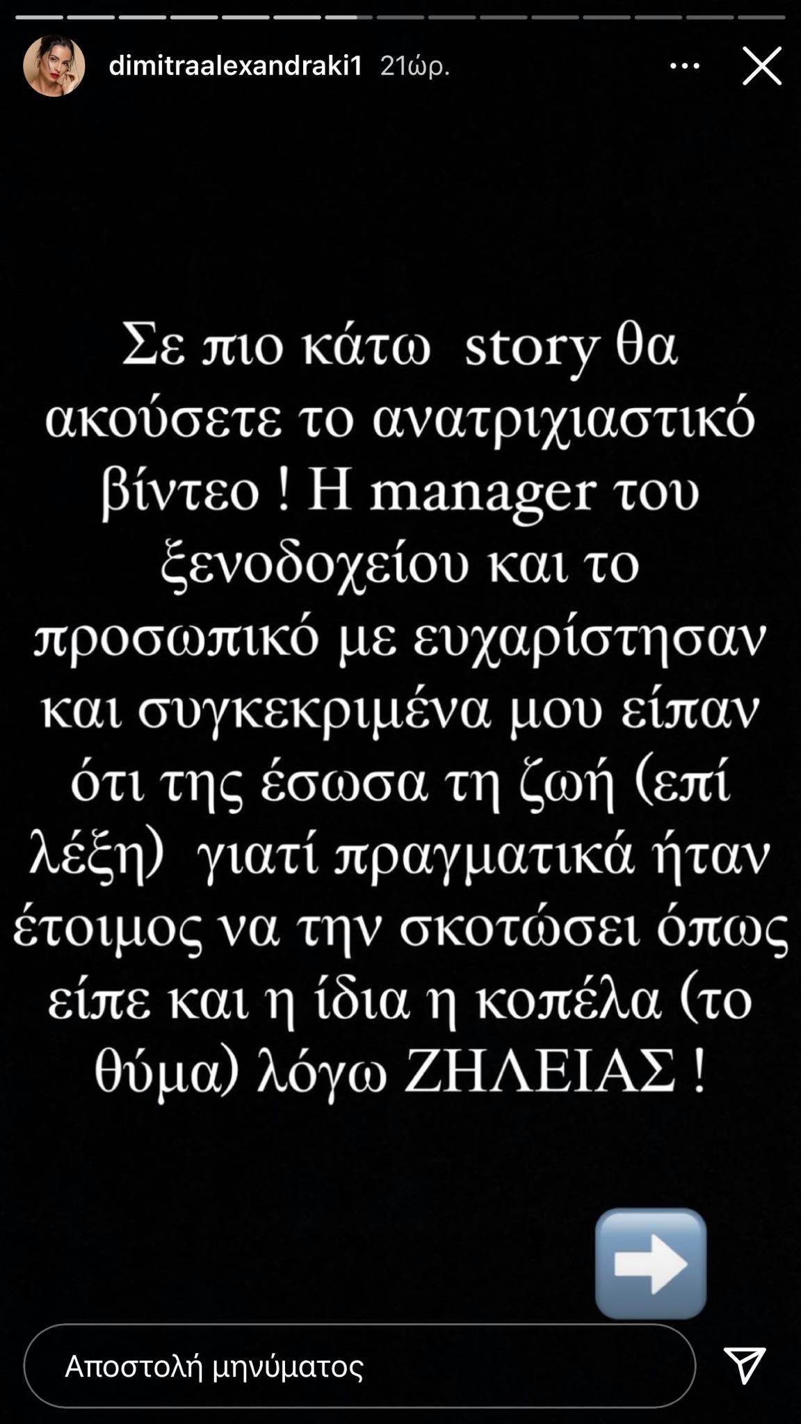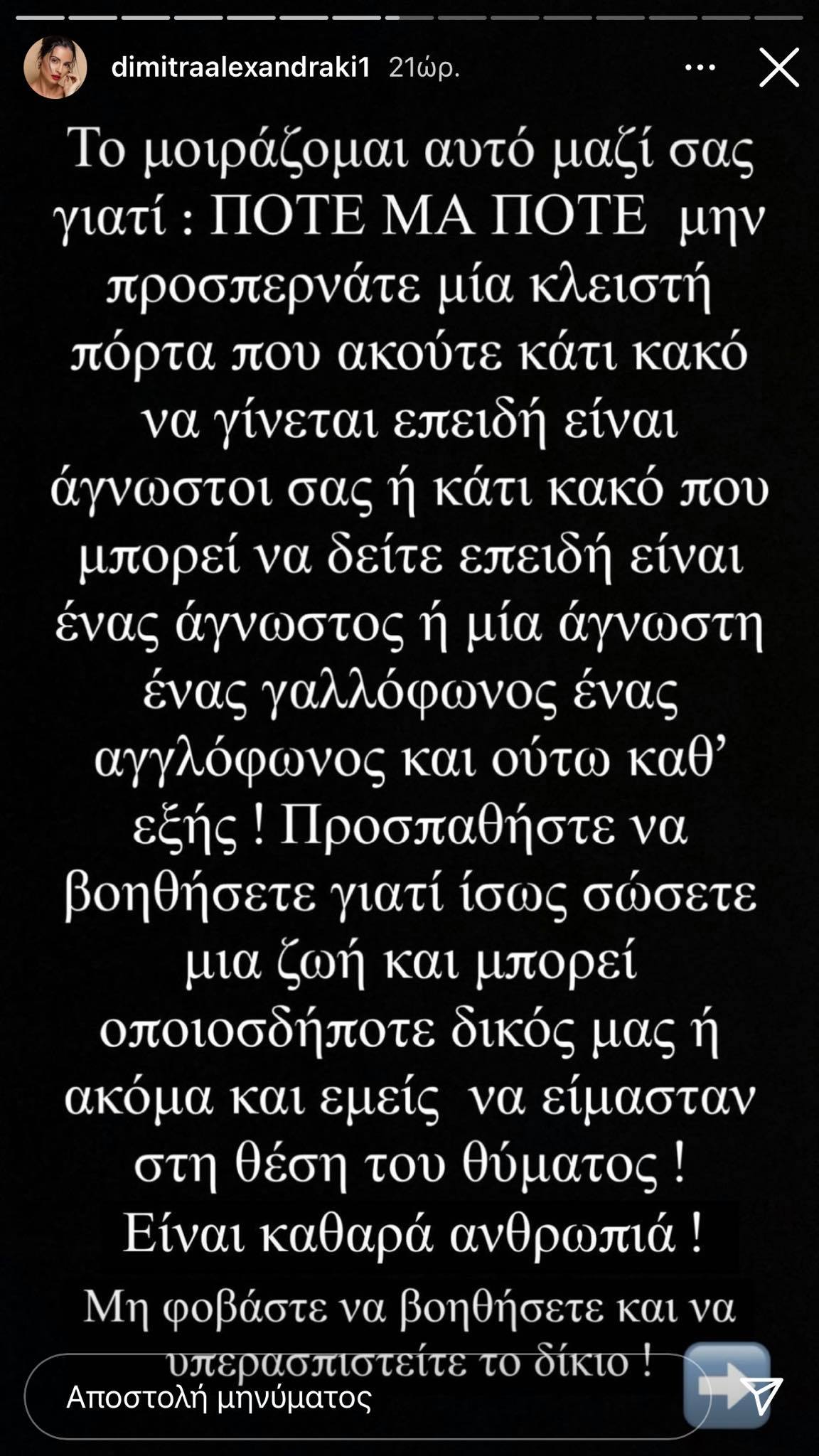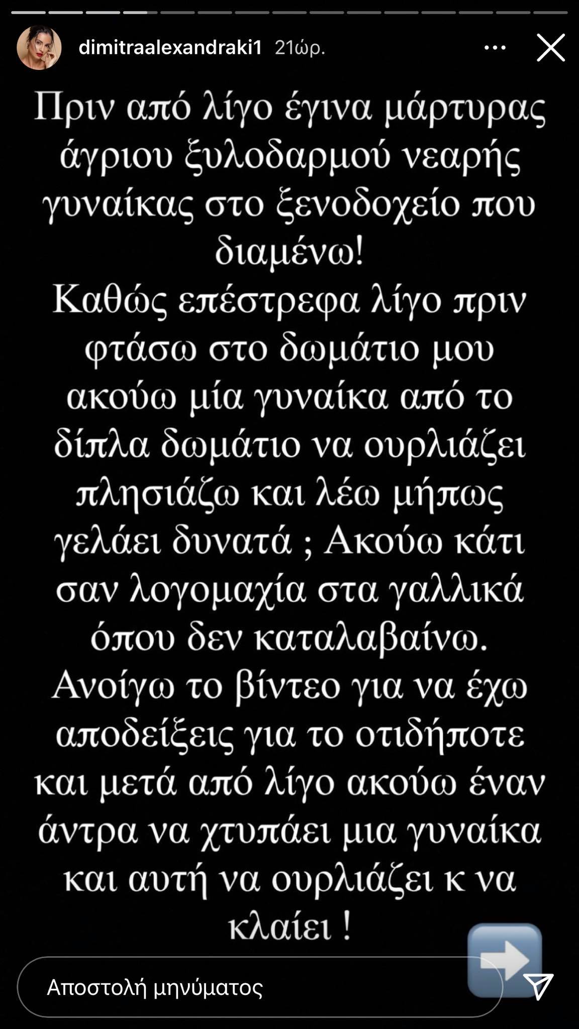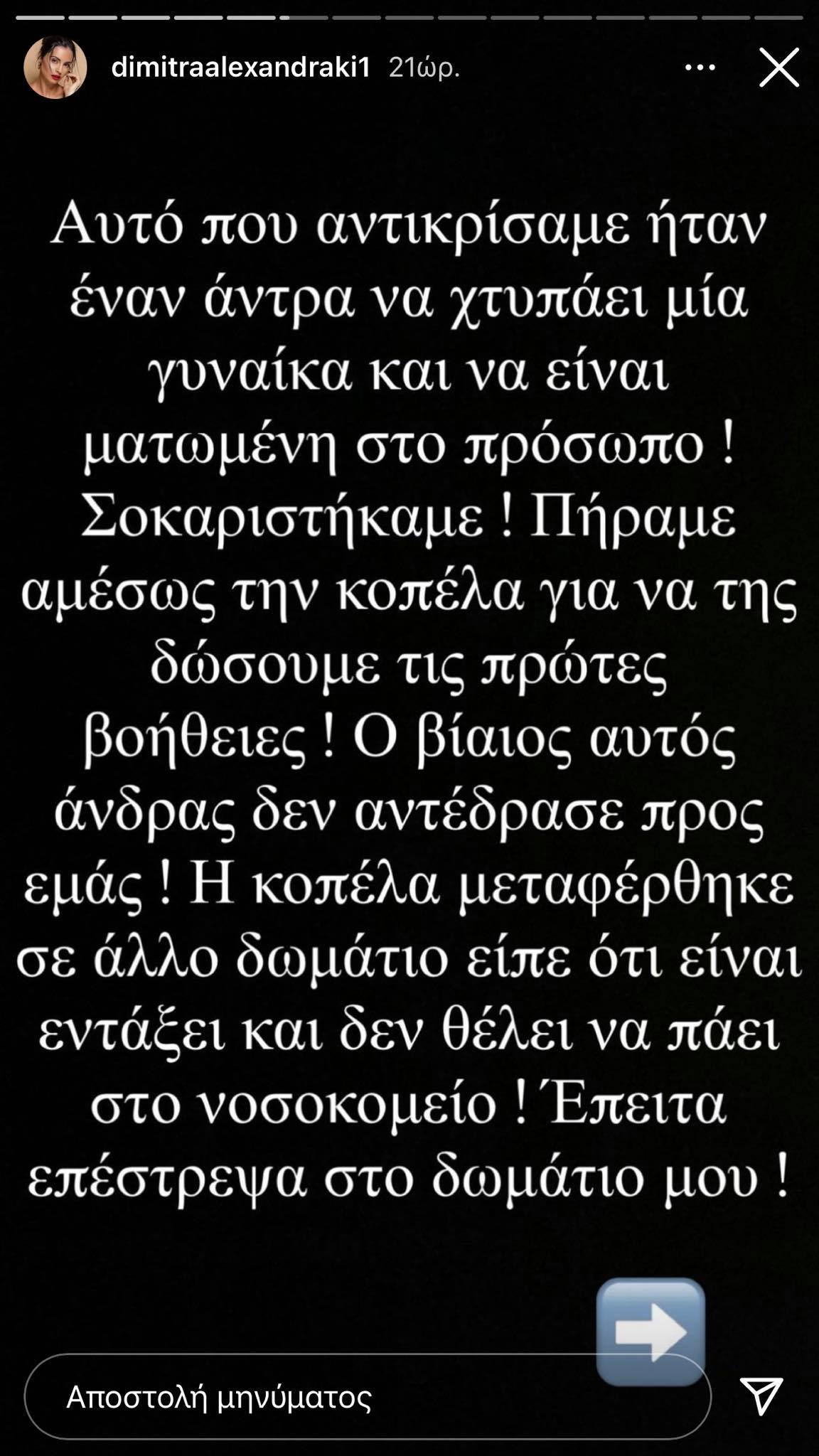 Σε μία σειρά από Insta stories προχώρησε η Δ.Αλεξανδράκη, μέσω των οποίων περιέγραψε ένα σοκαριστικό περιστατικό άγριου ξυλοδαρμού νεαρής γυναίκας στο οποίο έγινε μάρτυρας.