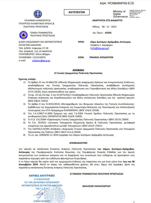 «Αποφασίζουμε την την κήρυξη σε κατάσταση Έκτακτης Ανάγκης Πολιτικής Προστασίας του Δήμου Διστόμου-Αράχωβας – Αντίκυρας της Περιφερειακής Ενότητας Βοιωτίας, της Περιφέρειας Στερεάς Ελλάδας για την άμεση