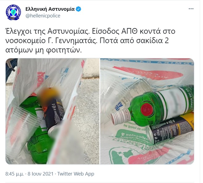 Την φωτογραφία που έδειχνε τη “λεία” της αστυνομίας, δηλαδή ένα μπουκάλι τζιν και μια σόδα, συνόδευε η εξής λεζάντα: “Έλεγχοι της Αστυνομίας. Είσοδος ΑΠΘ κοντά στο νοσοκομείο Γ. Γεννηματάς. Ποτά από σακίδια 2 ατόμων μη φοιτητών”. Ήδη από νωρίς το απόγευμα της Τρίτης, δυνάμεις της αστυνομίας είχαν περικυκλώσει το Πανεπιστήμιο, μετά τις αντιδράσεις που έχουν προκαλέσει τα κορονοπάρτι που διεξάγονταν το τελευταίο διάστημα στους χώρους του πανεπιστημιακού ιδρύματος.