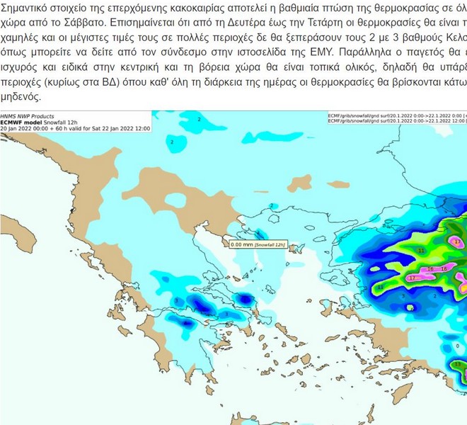 Από την πλευρά του, στη σύσκεψη που πραγματοποιήθηκε στο Υπουργείο την επόμενη μέρα, παρουσία και του ίδιου του Θοδωρή Κολυδά, ο διευθυντής της ΕΜΥ είχε κάνει λόγο για “ένα νέο τρέξιμο του μοντέλου που μας έδινε νωρίτερα τον ερχομό της κακοκαιρίας. Το προσδιορίσαμε και είχαμε πει ότι, τα πάρα πολύ έντονα φαινόμενα θα ξεκινήσουν ίσως και λίγο πριν από το μεσημέρι, σημειώνοντας ότι θα έχουμε τουλάχιστον 12 με 16 ώρες έντονων χιονοπτώσεων”.