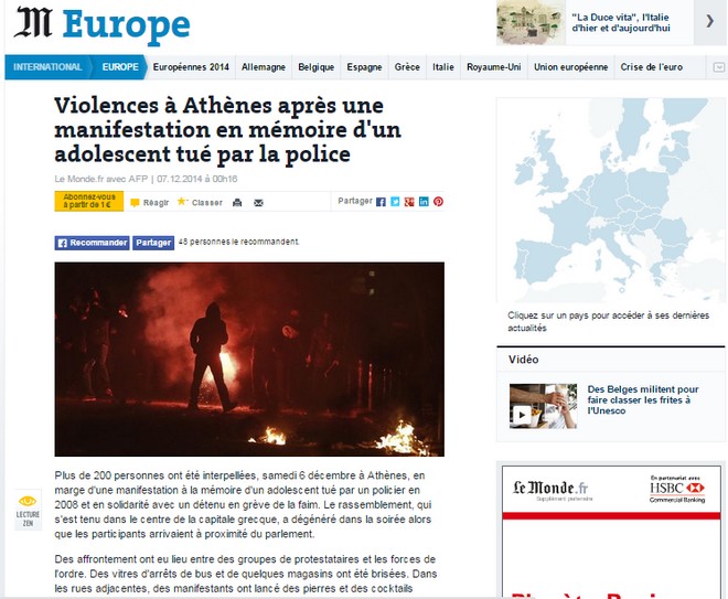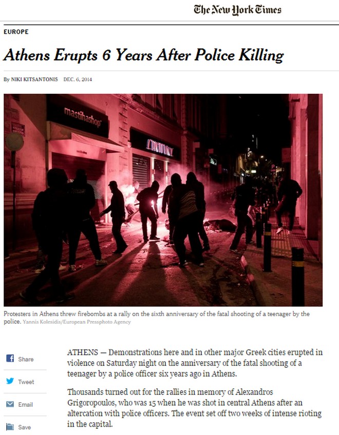 “Διαδηλώσεις στην πρωτεύουσα και άλλες μεγάλες πόλεις της Ελλάδα κατέληξαν στη βία το Σάββατο το βράδυ, με αφορμή την επέτειο του μοιραίου πυροβολισμού εφήβου από αστυνομικό έξι χρόνια πριν στην Αθήνα. Χιλιάδες κόσμου διαδήλωσαν στη μνήμη του Αλέξανδρου Γρηγορόπολου, ο οποίος ήταν 15 όταν σκοτώθηκε στο κέντρο της Αθήνας.” σημειώνει σήμερα η New York Times.