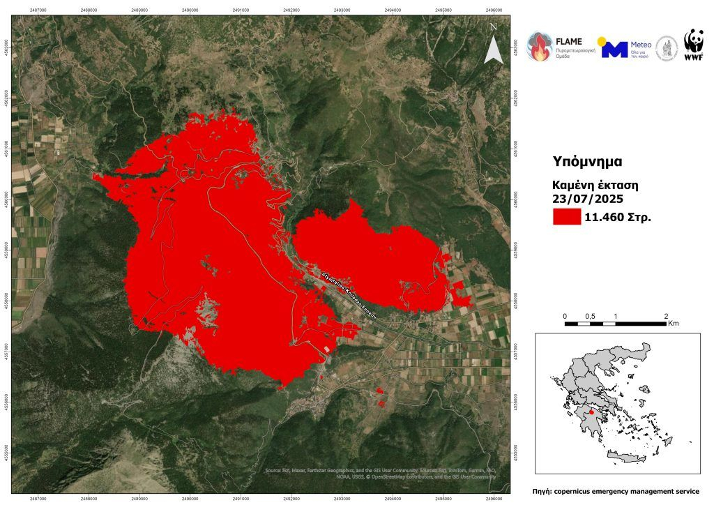 Σύμφωνα με την ανάλυση των δορυφορικών δεδομένων του ευρωπαϊκού μηχανισμού Copernicus EMS στις 23/07/2025 έχουν καεί μέχρι στιγμής 11.460 στρέμματα δασών, δασικών και αγροτικών εκτάσεων.
