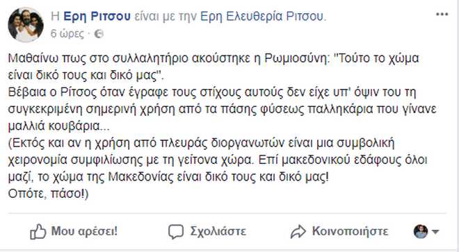 Με ανάρτησή της η κα. Ρίτσου αναφέρει “Μαθαίνω πως στο συλλαλητήριο ακούστηκε η Ρωμιοσύνη: “Τούτο το χώμα είναι δικό τους και δικό μας”. Βέβαια ο Ρίτσος όταν έγραφε τους στίχους αυτούς δεν είχε υπ’ όψιν του τη συγκεκριμένη σημερινή χρήση από τα πάσης φύσεως παλληκάρια που γίνανε μαλλιά κουβάρια… (Εκτός και αν η χρήση από πλευράς διοργανωτών είναι μια συμβολική χειρονομία συμφιλίωσης με τη γείτονα χώρα. Επί μακεδονικού εδάφους όλοι μαζί, το χώμα της Μακεδονίας είναι δικό τους και δικό μας! Οπότε, πάσο!)”