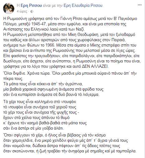 Την αντίδραση της κόρης του μεγάλου Έλληνα ποιητή Γιάννη Ρίτσου, Έρης Ρίτσου, προκάλεσε η χρήση του μελοποιημένου ποιήματος “Ρωμιοσύνη” που ακούστηκε στο συλλαλητήριο για την Μακεδονία στο Σύνταγμα.
