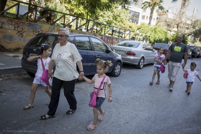 Η ογδονταπεντάχρονη κυρία Κίτσα Βασσιλειάδου, βοηθά τον Malek Bakri να πάει τις κόρες του στο σχολείο στο Ηράκλειο, Κρήτης, http://estia.unhcr.gr/