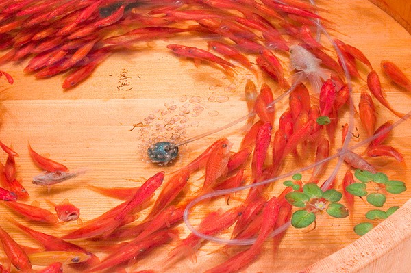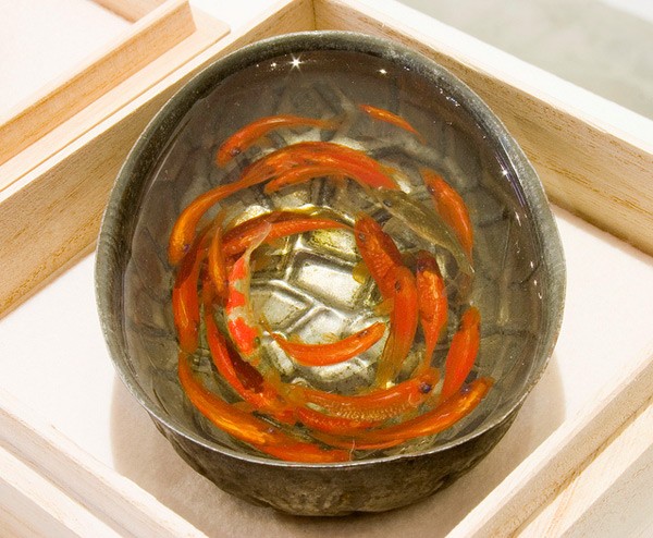 Ο καλλιτέχνης χρησιμοποιεί ακρυλικές μπογιές πάνω σε καθαρή ρητίνη δημιουργώντας ζωγραφιές με χρυσόψαρα.