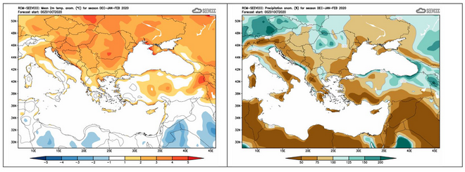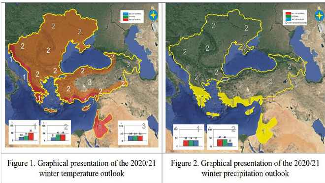 Οι πρώτες εκτιμήσεις δείχνουν ότι η χειμερινή θερμοκρασία είναι πιθανό να βρίσκεται κοντά ή πάνω από την κανονική τιμή για όλη την περιοχή SEECOF (ζώνη 2 στο Σχήμα 1), ενώ θα είναι πάνω από την κανονική κατά μήκος των ακτών της Αδριατικής, του Ιονίου, του Αιγαίου και της Μεσογείου με ενδοχώρα (ζώνη 1 στο σχήμα 1). Από την άλλη πλευρά, στα ηπειρωτικά μέρη της περιοχής του Καυκάσου και στο εσωτερικό της Τουρκίας (ζώνη 3 στο σχήμα 1) δεν υπάρχει σήμα για τις θερμοκρασίες του χειμώνα. Στα νότια της Ελλάδας, κατά μήκος των ακτών του Ιονίου, στις νότιες ακτές του Αιγαίου και της Ανατολικής Μεσογείου (ζώνη 1 στο σχήμα 2), τα σύνολα της χειμερινής βροχόπτωσης είναι πιθανό να είναι χαμηλότερα ή σχεδόν κανονικά, ενώ στην περιοχή της SEECOF (ζώνη 2 στην Εικόνα 2) η αβεβαιότητα είναι υψηλή και οι πιθανότητες για συνθήκες κάτω, κοντά ή πάνω από τον μέσο όρο είναι περίπου ίσες.