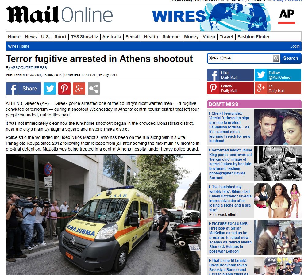 “Πυροβολισμοί στο κέντρο της Αθήνας», είναι ο τίτλος της βρετανικής Daily Mail. Στο ρεπορτάζ της η εφημερίδα αναφέρει ότι, μετά από ανταλλαγή πυροβολισμών στο Μοναστηράκι και σε ώρα αιχμής, η ελληνική αστυνομία συνέλαβε τον Ν. Μαζιώτη. Από την επιχείρηση τραυματίστηκαν ο ίδιος και άλλα τρία άτομα, ένας αστυνομικός και δύο τουρίστες.