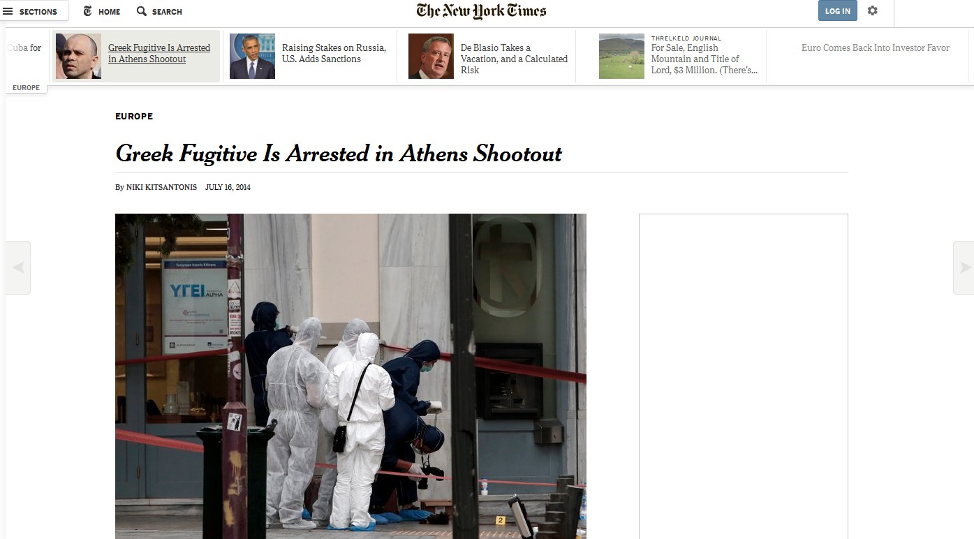 “Συνελήφθη ο πλέον καταζητούμενος τρομοκράτης της Ελλάδας, ο οποίος αυτοαποκαλείται ηγέτης της αριστερής επαναστατικής οργάνωσης “Επαναστατικός Αγώνας” αναφέρει η New York Times. Στο δημοσίευμα γίνεται σύντομη περιγραφή της επιχείρησης σύλληψης του καταζητούμενου και επισημαίνεται ότι, σύμφωνα με εκπρόσωπο της Αστυνομίας, τραυματίστηκαν ένας αστυνομικός και πολύ ελαφρά δύο τουρίστες, από την Αυστραλία και τη Γερμανία.