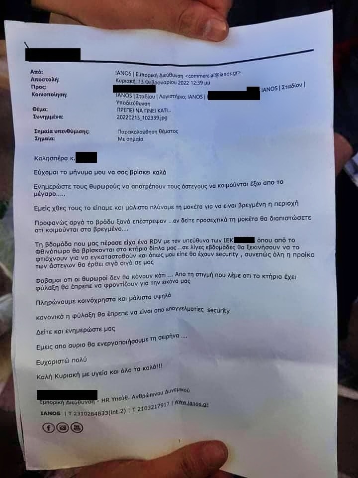Σύμφωνα με το περιεχόμενο του e-mail, το κατάστημα του Ιανού στην οδό Σταδίου βρέχει το βράδυ τη μοκέτα της εισόδου, προκειμένου να αποτρέψει σε άστεγους να περάσουν τη νύχτα τους εκεί, αναφέρει ότι οι άστεγοι πλέον κοιμούνται πάνω στη βρεγμένη μοκέτα, κάνει λόγο για αναγκαίους “Security” που θα διώχνουν τους ανθρώπους από τη βιτρίνα του καταστήματος ενώ μάλιστα προειδοποιεί ότι το κατάστημα θα βάλει μπροστά ακόμα και σειρήνα.