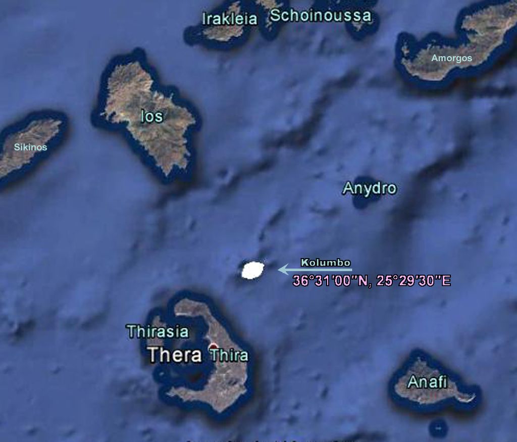 Το ηφαιστειακό σύμπλεγμα της Σαντορίνης περιλαμβάνει δύο ενεργούς ηφαιστειακούς πόρους, τον ηφαιστειακό πόρο της «Καμένης» που βρίσκεται στον χερσαίο χώρο της ομώνυμης νησίδας μεταξύ Θήρας και Θηρασιάς και τον υποθαλάσσιο ηφαιστειακό πόρο του «Κολούμπο» ο οποίος βρίσκεται σε απόσταση 8,5 περίπου χιλιομέτρων ΒΑ του ομώνυμου ακρωτηρίου στο βορειανατολικό άκρο του νησιού της θήρας.