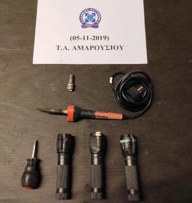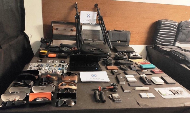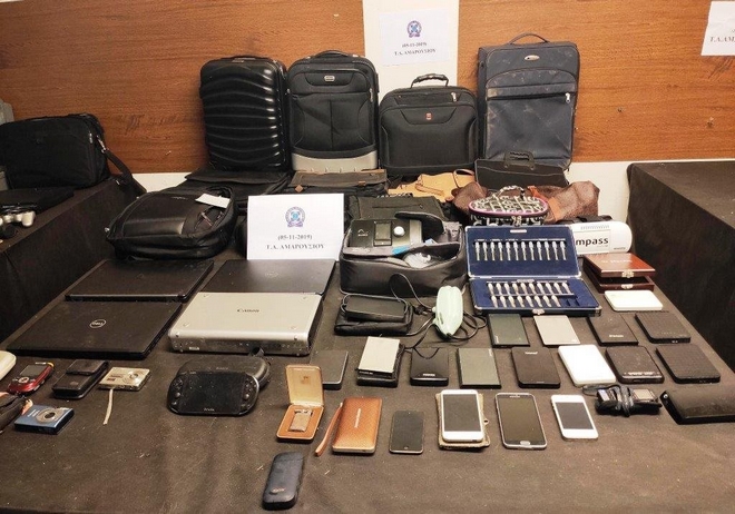 Στην κατοχή του και μετά από κατ’ οίκον έρευνα, βρέθηκαν και κατασχέθηκαν τέσσερις ηλεκτρονικοί υπολογιστές, πλήθος γυαλιών οράσεως και ηλίου, πλήθος τσαντών και πορτοφολιών, τέσσερα ρολόγια, πλήθος ηλεκτρονικών συσκευών και κινητών, ιαρρηκτικά εργαλεία και φακοί.