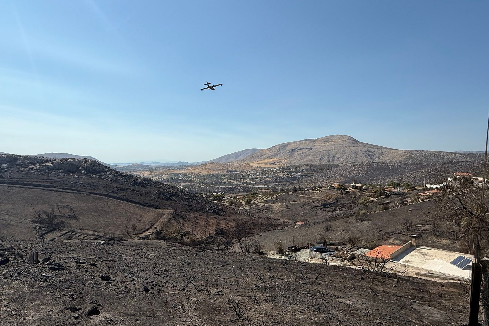Το ίδιο ακούω από την κα. Αρτεμις. Την συναντώ έξω από το σπίτι της, στο γειτονικό οικισμό Δημουλάκη να κοιτάζει από ένα ύψωμα τις απέραντες καμένες εκτάσεις που απλώνονται μπροστά της. «Βλέπω τα αεροπλάνα που πετούν εδώ χαμηλά και θέλω να είμαι βέβαιη ότι δεν θα έχουμε πάλι κάποια αναζωπύρωση» λέει.