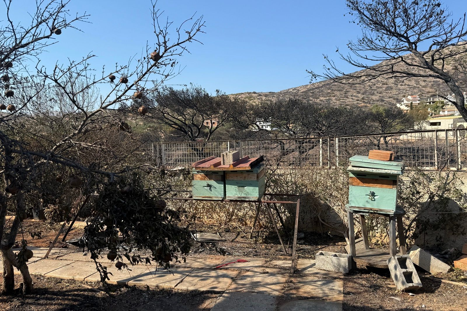 Μέσα στην στεναχώρια και στο μαύρο που επικρατεί στην αυλή του, υπάρχουν μερικά τιρκουάζ κουτιά. Τον ρωτάω τι είναι και για μια στιγμή φωτίζεται το πρόσωπό του, «αυτές είναι τρεις κυψέλες με μέλισσες που σώθηκαν από την φωτιά. Οι άλλες τρεις κάηκαν. Αυτές οι μέλισσες που έμειναν είναι το μόνο που μου δίνει αισιοδοξία αυτή την στιγμή».