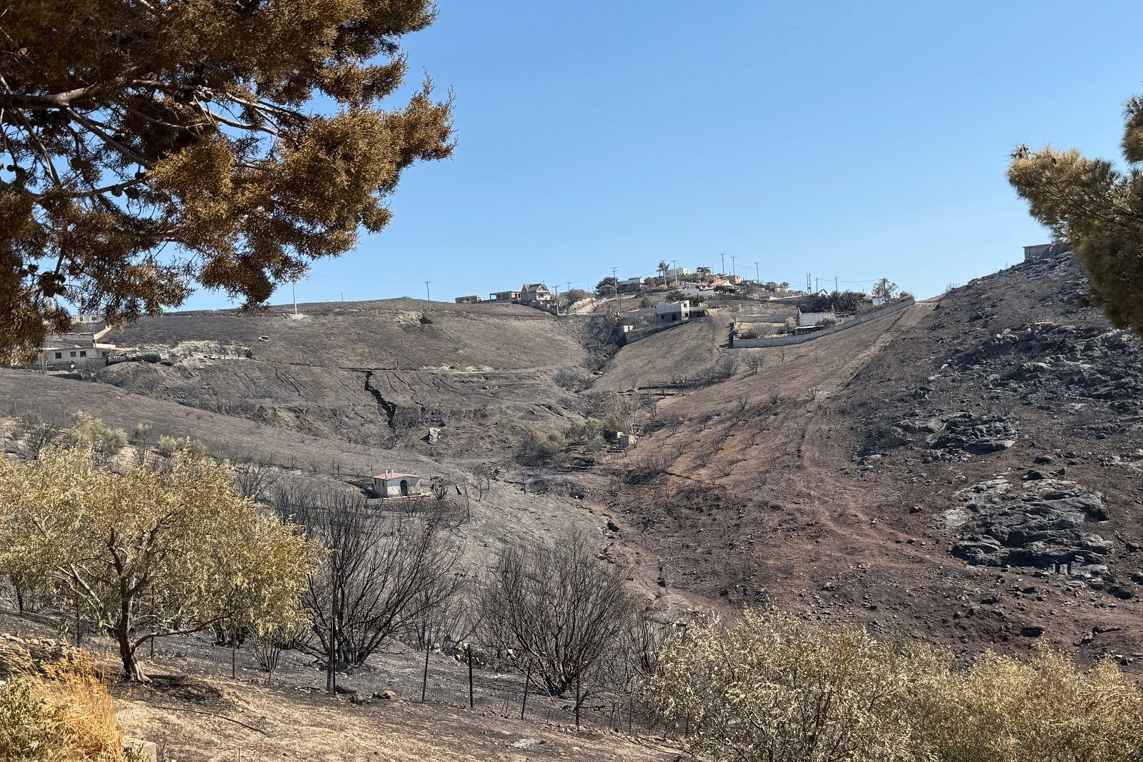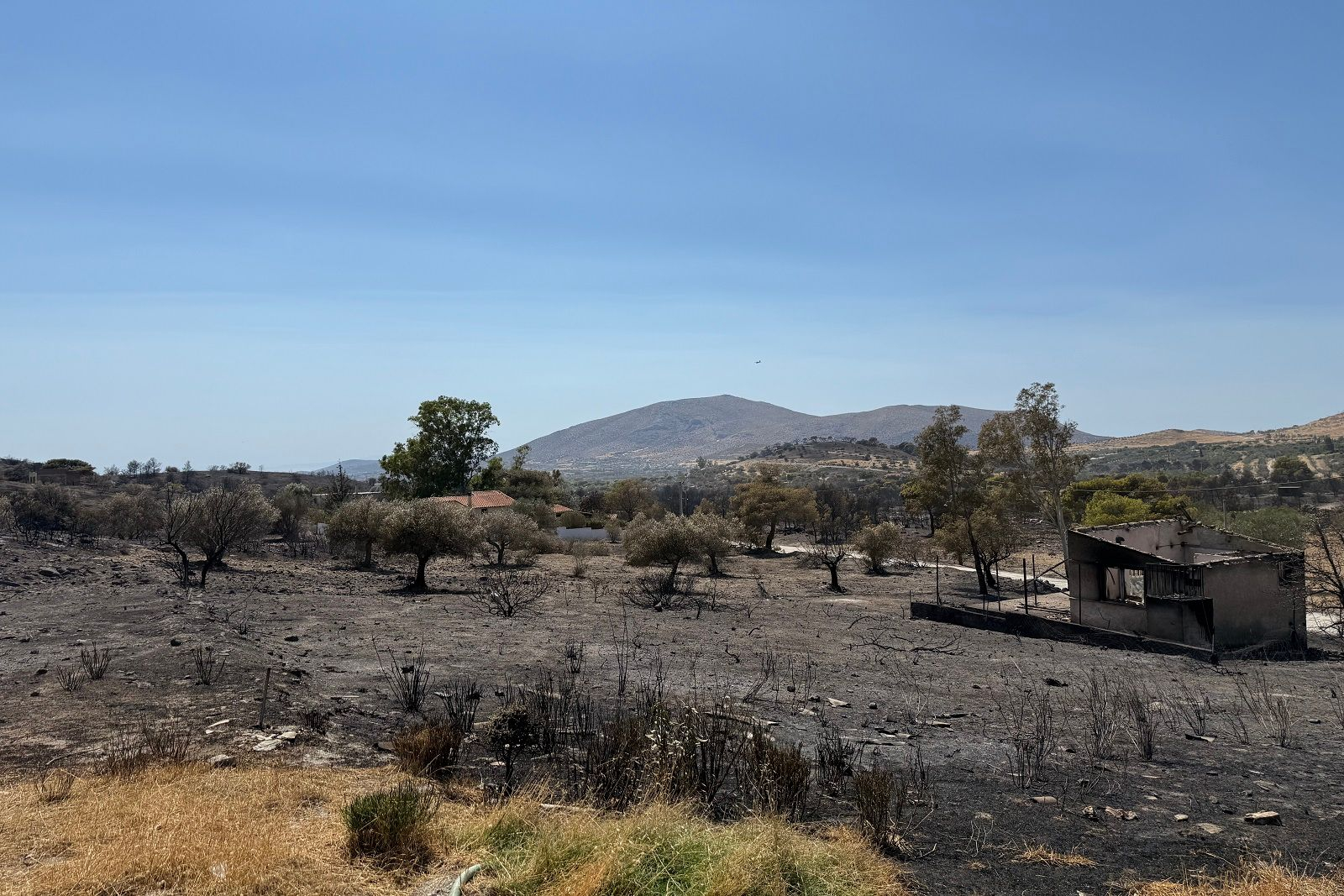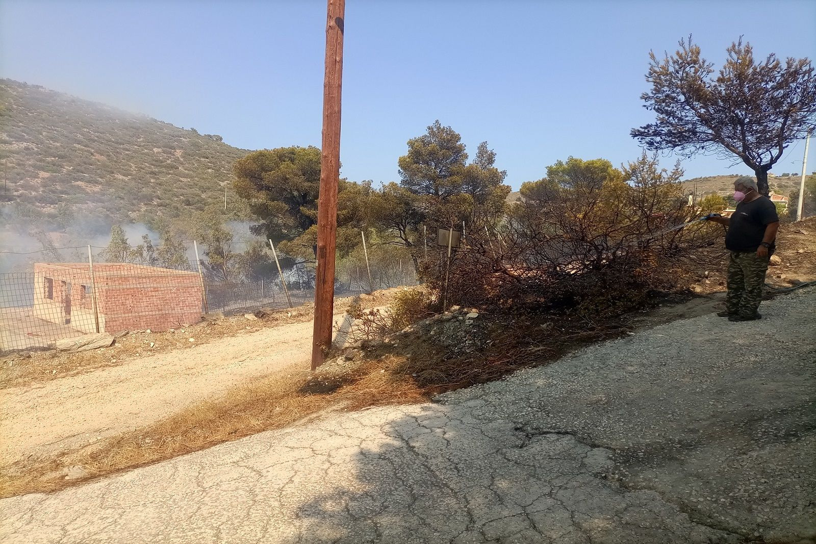 Όπως μου δείχνει τα πάντα γύρω από το σπίτι της έχουν γίνει στάχτη. «Αν δεν ήταν ο άνδρας μου να φροντίσει να καθαρίζει ακόμα και τα γειτονικά χωράφια και να κλαδεύει τα γειτονικά δέντρα, δεν θα είχε σωθεί το σπίτι μας. Έμεινε εκείνος με τον γιό μου και με κουβάδες το σώσανε» μου λέει με ανησυχία.