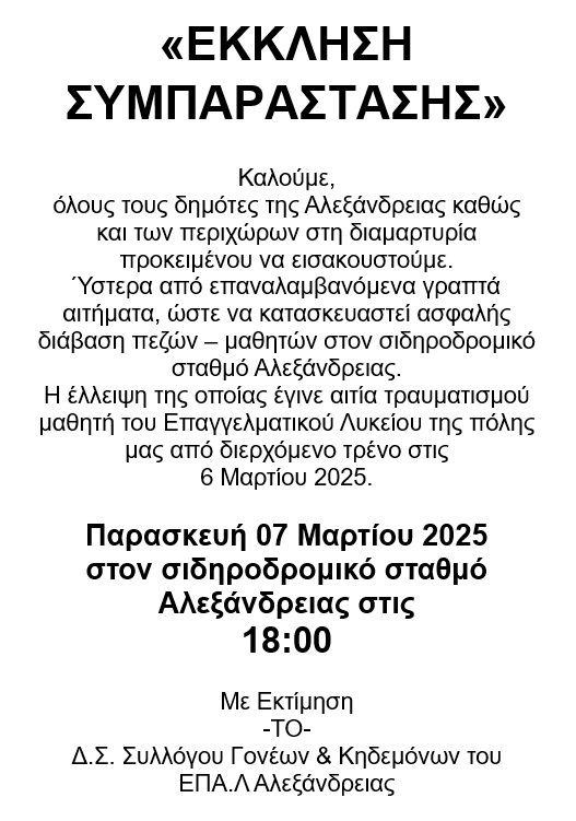 Παρασκευή 07 Μαρτίου 2025 στον σιδηροδρομικό σταθμό Αλεξάνδρειας στις 18:00″.