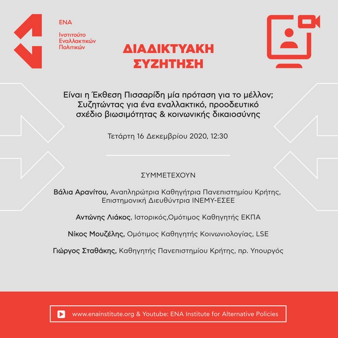 Το ινστιτούτο ΕΝΑ διοργανώνει την ερχόμενη Τετάρτη, 16 Δεκεμβρίου, διαδικτυακή συζήτηση με θέμα “Eίναι η Έκθεση Πισσαρίδη μία πρόταση για το μέλλον; Συζητώντας για ένα εναλλακτικό, προοδευτικό σχέδιο βιωσιμότητας & κοινωνικής δικαιοσύνης”.