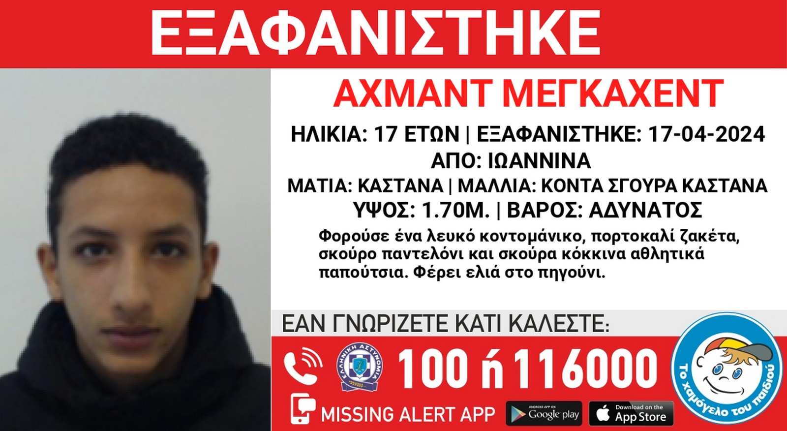 Συναγερμός έχει σημάνει στις Αρχές για την εξαφάνιση του 17χρονου Αχμάντ Μέγκαχετν, με καταγωγή από την Αίγυπτο, τα ίχνη του οποίου εξαφανίστηκαν το απόγευμα της Τετάρτης (17/04) από χώρο φιλοξενίας στα Ιωάννινα.