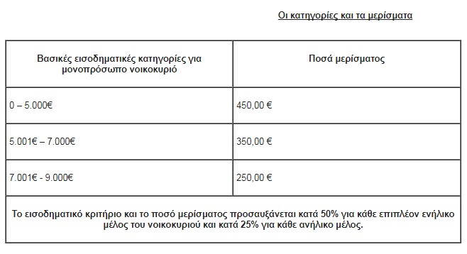 -Ζευγάρι με 1 ανήλικο παιδί και συνολικό εισόδημα 14.500€ το 2016. Εμπίπτουν στην τρίτη εισοδηματική κλίμακα που γι αυτούς διαμορφώνεται στα 12.250€ – 15.750€ και δικαιούνται μέρισμα 437,5€.