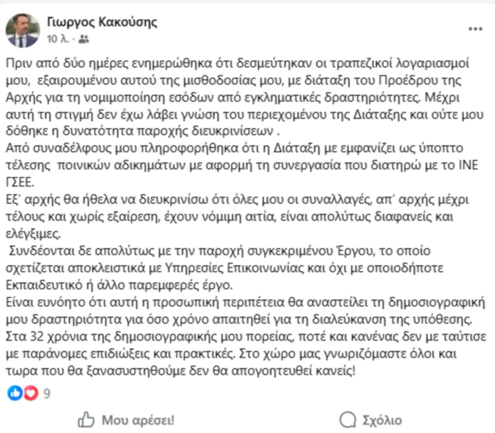 Ο δημοσιογράφος της ΕΡΤ ανέφερε τα παραπάνω σε ανάρτησή του στα social media, τονίζοντας, επίσης, πως ενημερώθηκε προ δύο ημερών για τη δέσμευση των τραπεζικών του λογαριασμών και πως μέχρι αυτή τη στιγμή δεν έχει λάβει γνώση του περιεχομένου της σχετικής Διάταξης. Υπογραμίζει ακόμα πως έμαθε από συναδέλφους του ότι εμφανίζεται ως ύποπτος στην υπόθεση, ενώ ξεκαθαρίζει ότι όλες του οι συναλλαγές είναι απολύτως διαφανείς.