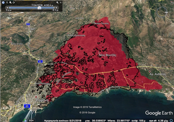 Οι δύο εικόνες που ακολουθούν αποτυπώνουν από την πρόγνωση του IRIS στην περίπτωση της φωτιάς στο Μάτι. Το πρώτο είναι για τις 19:30 που η φωτιά πλέον είχε φτάσει στην παραλία, και το δεύτερο είναι το τελικό αποτύπωμα όπως το προέβλεψε το IRIS, γύρω στις 4 το πρωί της 24/07/2018, όταν η φωτιά είχε ουσιαστικά σταματήσει να εξαπλώνεται. Η μαύρη γραμμή είναι το τελικό περίγραμμα της φωτιάς με βάση δορυφορικά δεδομένα.