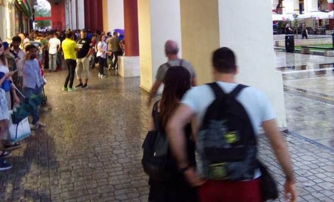 Στο κέντρο της πόλης οι δρόμοι έχουν μετατραπεί σε ποτάμια με τους πεζούς να προσπαθούν να προστατευτούν όπου βρουν