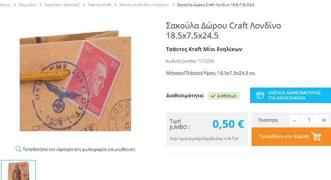 Η “Σακούλα Δώρου Craft Λονδίνο” στην κατηγορία “Τσάντες Kraft Μίνι Ενηλίκων” που πωλείτο από τα καταστήματα Jumbo, προκάλεσε έντονες αντιδράσεις για έναν λόγο που δεν φαινόταν εκ πρώτης όψεως.