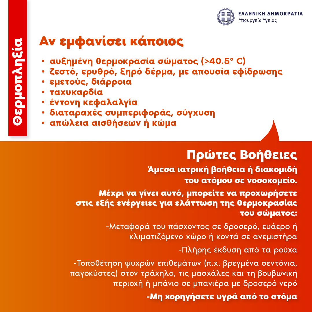 Στα γραφήματα παρατίθενται τα συμπτώματα της θερμικής εξάντλησης και της θερμοπληξίας καθώς και οι πρώτες βοήθειες. Επίσης δίνονται οδηγίες για την προστασία από τον καύσωνα και την φροντίδα ευάλωτων ομάδων.