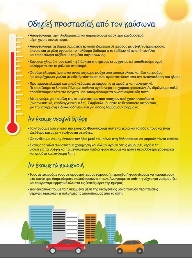 Πιο συγκεκριμένα, ενόψει του επικείμενου καύσωνα το υπουργείο Υγείας συστήνει στο κοινό και ιδιαίτερα στα άτομα που ανήκουν στις ομάδες υψηλού κινδύνου, όπως: