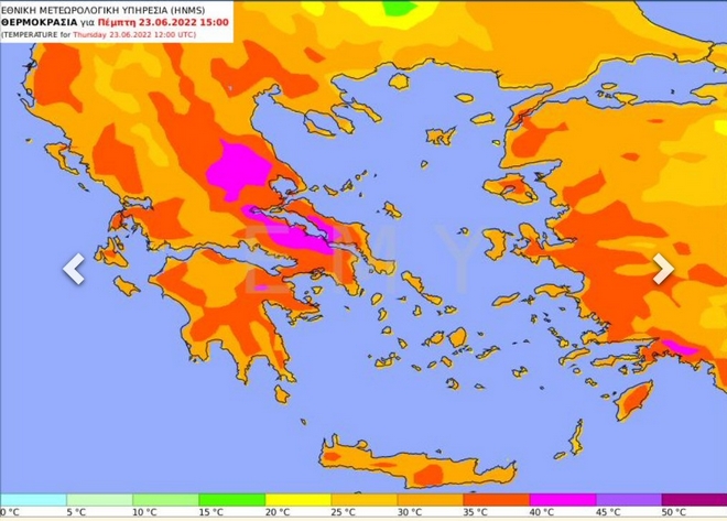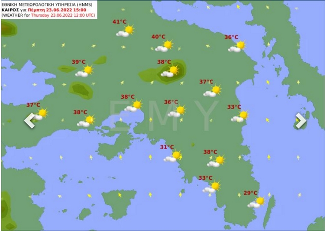 - Την Πέμπτη (23-06-2022) τους 36 με 39 βαθμούς και τοπικά στη Θεσσαλία, την ανατολική Στερεά και την κεντρική Μακεδονία τους 40 με 41 βαθμούς Κελσίου.